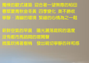 獨棟的歐式建築,富麗高雅的大廳提供旅人歇腳、談趣的最佳空間;溫馨明亮的客房則提供了旅人靜心休息的寧靜氛圍,潔淨而溫馨的空間,艾美休閒民宿期待您的到來。